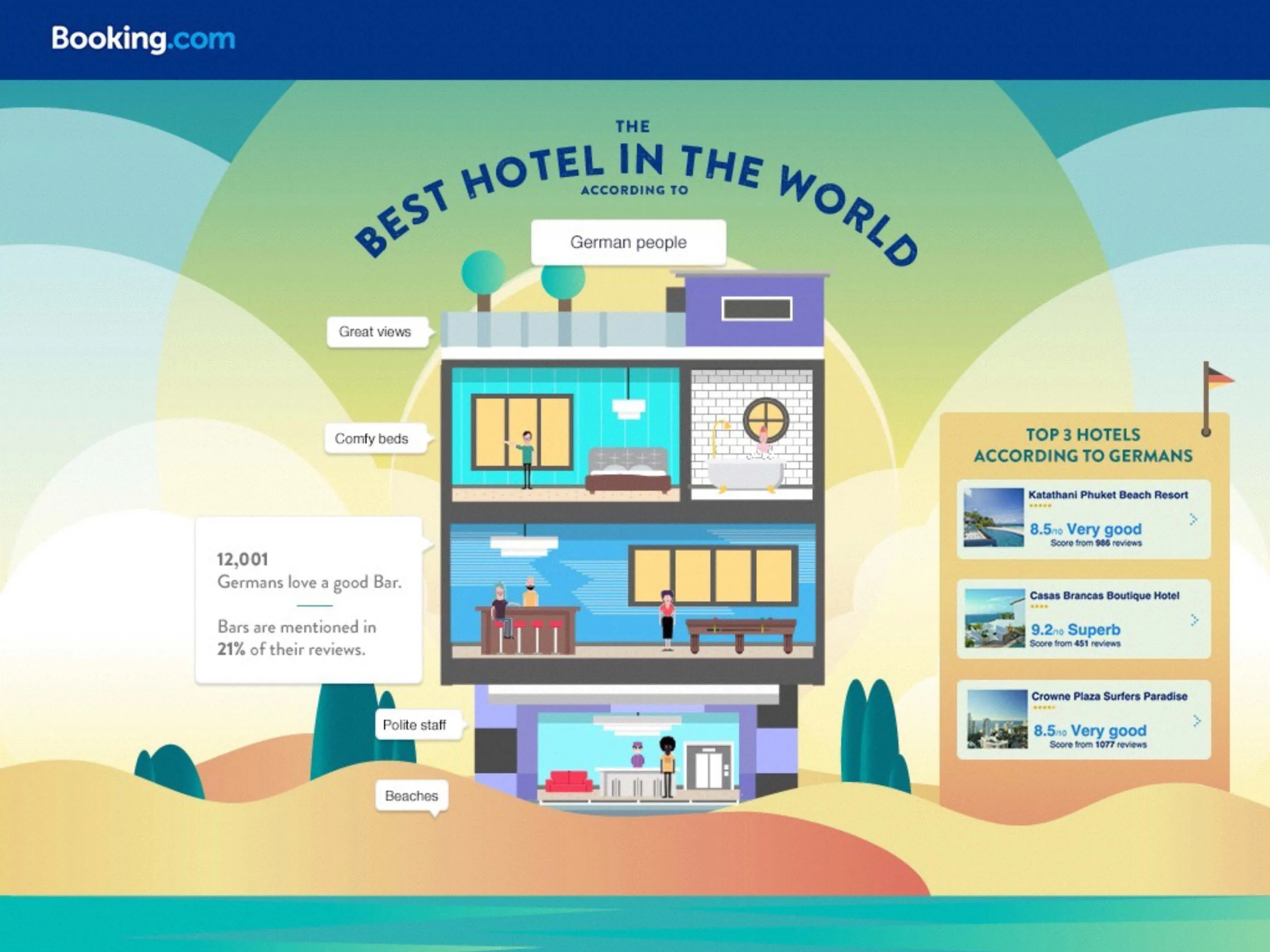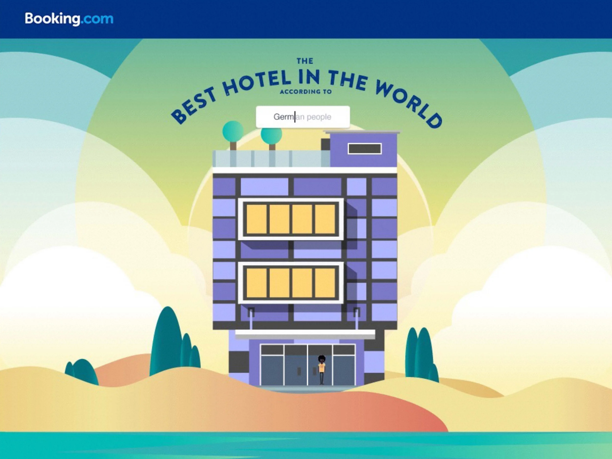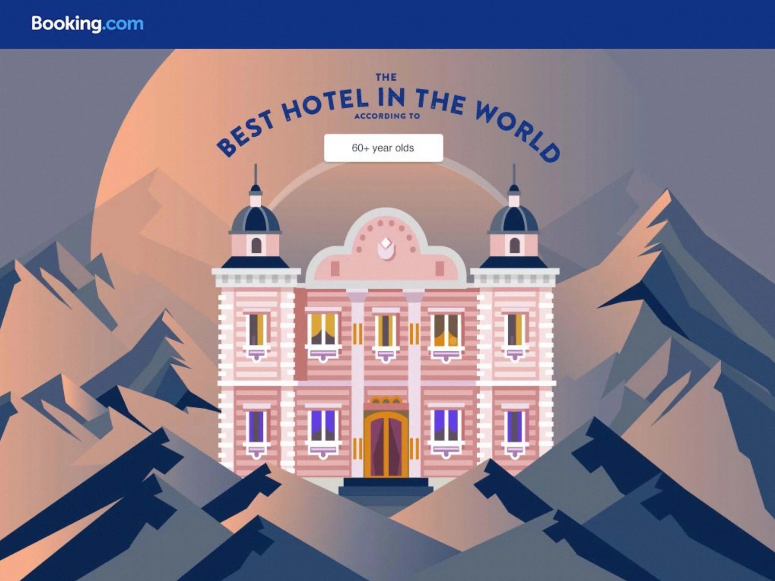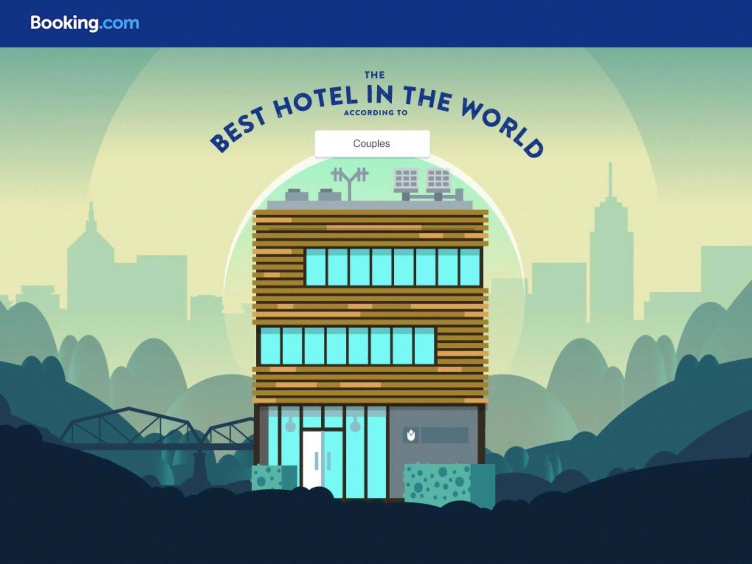 An illustrated hotel which updates to reflect the kind of holidays and accommodation Booking.com customers are currently booking.