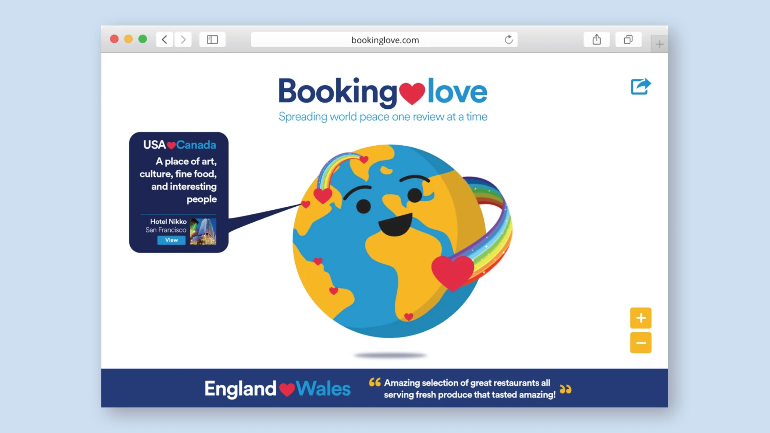 Start with two nations who don’t get along. Find positive reviews people have left after visiting each other’s countries, from the tens of millions (it really is that many) posted on Booking.com. Then play them back to each other. Instant global harmony.